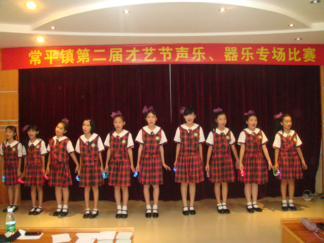 ??? 常平第二小學(xué)是由原白石崗、田尾、沙湖口、白花瀝、松柏塘小學(xué)合并而成的,現(xiàn)有學(xué)生900多人。2008年,在上級主管領(lǐng)導(dǎo)的關(guān)心下,學(xué)校把“童聲合唱”作為藝術(shù)教育的特色項(xiàng)目,在當(dāng)時(shí)全校400多個(gè)孩子中選拔出50多位嗓音、樂感較好的學(xué)生進(jìn)行合唱訓(xùn)練,由本校音樂教師林?B擔(dān)任訓(xùn)練指揮。