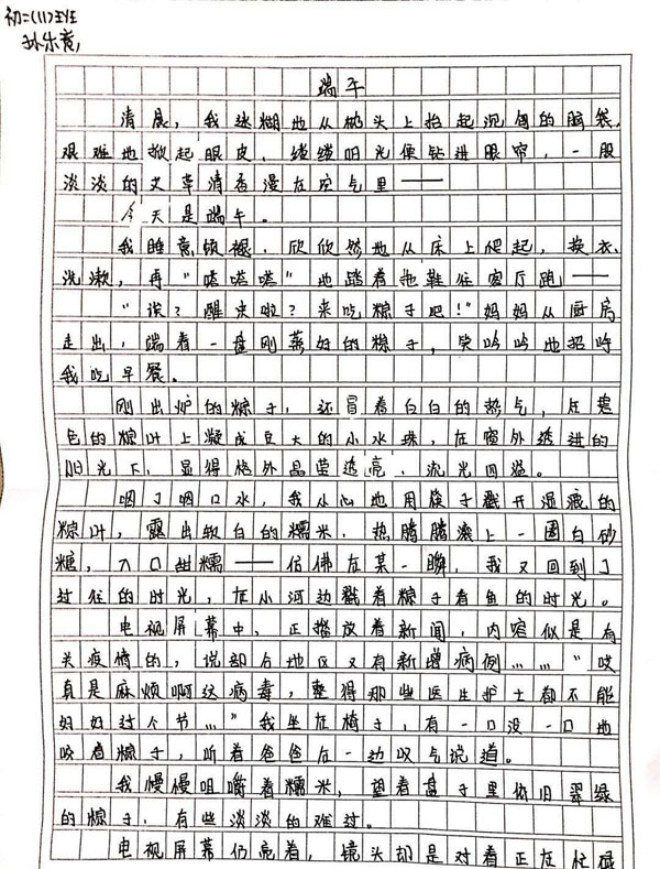 這次端午節(jié)主題活動內(nèi)容有:1、“粽子情,我們傳”。要求初一級學(xué)生在2020年6月25-27(端午假期)在家里包一次粽子、制作香囊、掛艾草。2、“傳經(jīng)典,誦祖國”。要求初二級學(xué)生以端午節(jié)為主題,朗誦一首詩歌(視頻拍攝)、寫一篇抒情文章、書寫一幅對聯(lián)。初一、初二級各班都積極開展了“端午主題”活動,讓學(xué)生感悟傳統(tǒng)文化的魅力,接受中華悠久文明的洗禮和傳統(tǒng)美德的熏陶,增強民族自豪感,用中華傳統(tǒng)節(jié)日引領(lǐng)同學(xué)們詩意成長。