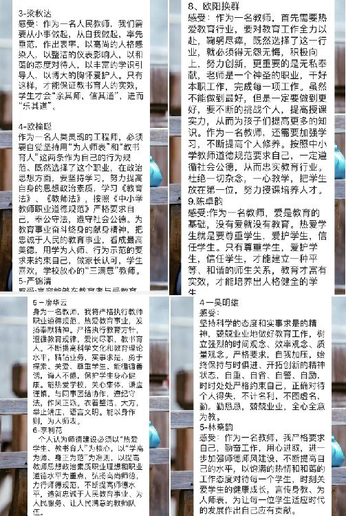 在本次的線上集體學(xué)習(xí)中,通過對8起典型問題的了解和反思,龍江城小全體教師深刻認(rèn)識到師德“紅線”不可逾越。在嚴(yán)守“紅線”的同時,要謹(jǐn)記自己肩負(fù)的職責(zé)和使命,不斷錘煉教育報國之志,時刻堅守為黨育人、為國育才初心,自覺堅守精神家園、堅守人格底線,率先垂范、以身作則,培養(yǎng)擔(dān)當(dāng)民族復(fù)興大任的社會主義建設(shè)者和接班人。