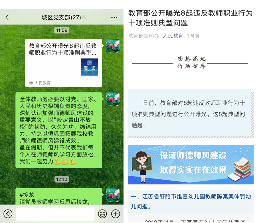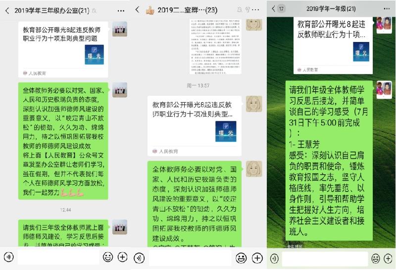 “師者,以德為先”。高尚的師德師風(fēng)是教師從事教育工作的靈魂。為了進(jìn)一步加強(qiáng)教師隊伍建設(shè),不斷提高教師職業(yè)道德素質(zhì)和師德修養(yǎng),保障全體教師在良好師德師風(fēng)塑造和學(xué)習(xí)中的不松懈和持續(xù)性,7月27日-30日,在暑假期間,龍江城區(qū)中心小學(xué)組織全體教師在線上重點(diǎn)學(xué)習(xí)了“教育部公開曝光8起違反教師職業(yè)行為十項準(zhǔn)則典型問題”一文,并進(jìn)行了自我反思和學(xué)習(xí)心得的分享交流。