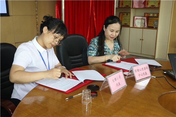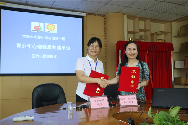 6月23日下午,大都小學與佛山市朗晴心理青少年心理健康共建單位簽約與揭牌儀式在大都小學會議室隆重舉行。大都小學梁惠銘校長以及全體行政、大都村婦女兒童之家主席何秀云、朗晴心理咨詢中心專家謝雪玲等出席簽字揭牌儀式,儀式由楊俊主任主持。