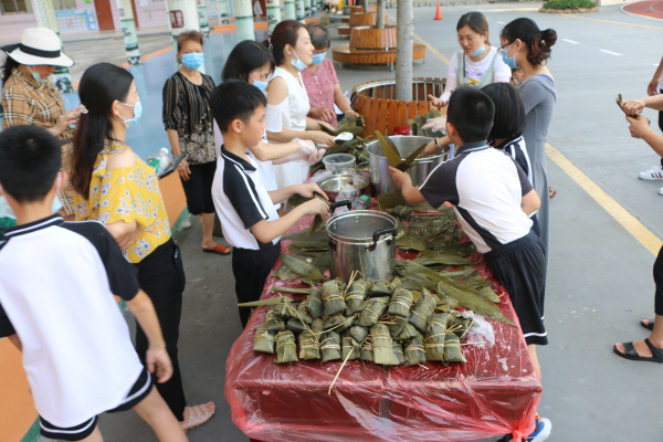 在校園里與學生一起動手裹粽子。家長親手教學生學習怎么裹粽子,看起來簡單的技巧,操作起來也不容易。學生在有序地、滿滿地操作中感受那種傳統(tǒng)習俗,傳統(tǒng)文化,為民族文化的傳承努力著。雖然裹出來的粽子并沒有家長們裹得那么美觀,但從實踐中感受的卻是豐富而快樂!