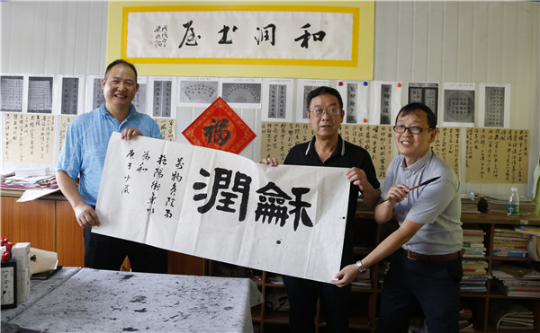 專家們走進(jìn)“和潤書屋”,看到一幅幅學(xué)生洋洋灑灑的書法作品,當(dāng)場感受到濃濃的文化熏陶,他們也忍不住內(nèi)心的激動和熱情,現(xiàn)場揮筆疾書,題下“和潤”和“香遠(yuǎn)益清”兩幅墨寶,并以此作為對“和潤教育”的肯定,贈予學(xué)校留念。