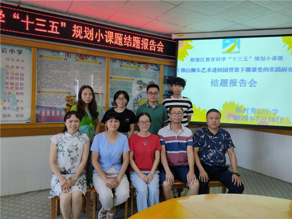 2020年7月16日上午,順德區(qū)2019年度教育科學“十三五”規(guī)劃小課題《佛山獅頭藝術進校園背景下微課堂的實踐研究》課題結題總結會在陳村鎮(zhèn)青云小學舉行。參加結題鑒定會議的指導專家有:順德區(qū)陳村鎮(zhèn)美術教研組組長、順德區(qū)陳村鎮(zhèn)陳惠南紀念中學的初中美術高級教師陳榮添老師、順德區(qū)陳村鎮(zhèn)中學的初中美術高級教師彭產興老師、順德區(qū)陳村鎮(zhèn)中學的初中美術高級教師周遠新老師。除此之外,還有陳村鎮(zhèn)青云小學甘愛儀校長、曾玲副主任以及課題組全體成員等參加了會議。