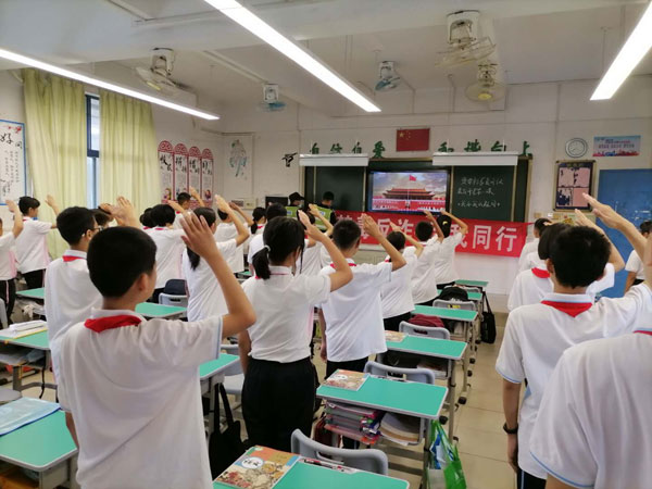 首先,舉行了新學(xué)期莊嚴(yán)的奏唱國(guó)歌儀式,全體師生肅穆而立,奏唱國(guó)歌,展現(xiàn)了陳村鎮(zhèn)初級(jí)中學(xué)全體師生昂揚(yáng)向上、拼搏進(jìn)取的精神風(fēng)貌。