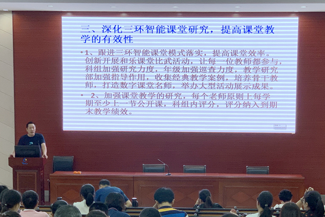 會(huì)議首先由教學(xué)研究部負(fù)責(zé)人金銀紅主任和學(xué)生發(fā)展部負(fù)責(zé)人周霞副校長(zhǎng)分別小結(jié)各自部門開學(xué)至今一個(gè)月的工作情況并解讀了本學(xué)期工作安排,讓全體教師明了過往工作情況和今后的工作方向。