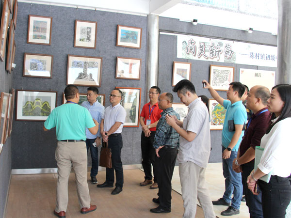復評工作組一行在校長謝文忠校長、李日和副校長的陪同下,饒有興趣地察看了陳村鎮(zhèn)初級中學版畫宣傳展板,并在展板前駐足停留,詳細詢問陳村鎮(zhèn)初級中學“版畫特色”辦學情況。廣東省版畫名師工作室的彭產(chǎn)興老師結(jié)合展板圖片,從版畫創(chuàng)作情況、版畫氛圍的營造、版畫校園文化的布置、版畫圖書的購置、以及版畫各種活動及所取得的成績等方面做了簡要的匯報。隨后,復評工作組一行巡視了版畫文化長廊,深入察看版畫工作室、查閱版畫資料對學校的版畫文化藝術(shù)傳承工作進行了綜合評估。總結(jié)會上復評工作組專家對學校版畫傳統(tǒng)文化藝術(shù)傳承工作給予了高度評價,并對學校版畫建設(shè)工作的開展提出了專業(yè)的指導。臨行之前,復評工作組一行表示,陳村鎮(zhèn)初級中學“版畫特色”建設(shè)卓有成效,希望陳村鎮(zhèn)初級中學再接再厲,通過“版畫”建設(shè),營造全校傳承傳統(tǒng)文化的氛圍,弘揚中華傳統(tǒng)文化,為學生的終身發(fā)展奠定堅實的文化基礎(chǔ)。