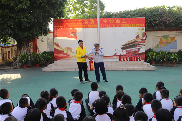 下午四點鐘,警報再次響起。全校師生按照方案路線,彎腰捂口鼻,有序迅速聚攏到升旗臺前。升旗臺上早已經擺好了演練道具:煤氣罐、滅火器。在學生們熱烈的掌聲中,陳村鎮(zhèn)專職消防隊防火員、梁釗林紀念小學消防校長劉國興緩步走上升旗臺,儒雅地給全體師生行了禮之后給同學們介紹相關的消防安全知識。接下來,劉國興校長親自給師生們示范如何滅火。劉校長右手握著火把,左手擰開煤氣罐,迅速點燃煤氣,熊熊大火呼嘯而出,學生們都為之提心吊膽,都屏息凝視。劉校長不慌不忙,左手緊握滅火器手柄,右手拔下掛鉤,一邊摁下閥門,一邊提起虹吸管對準火苗掃噴。火苗立刻給滅掉,劉校長緊接著關緊煤氣罐的氣閥,煤氣呼呼的噴涌聲也給遏制了。學生們情不自禁、不約而同響起了贊美的掌聲。接下來,保安、清潔工、老師、學生代表都輪流參與了滅火。他們從實操中掌握了如何用滅火器滅火。學生們都喜歡這樣別開生面的演練活動,他們把頭抬得高高的,生怕看漏了演練里的一些內容。