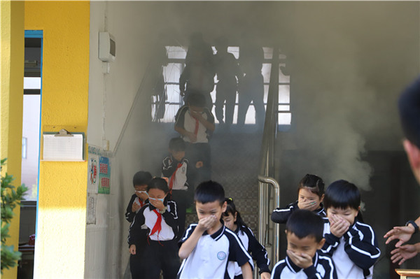 十三點整,警報聲響徹校園,濃煙滾涌而來,學生們按照地上箭頭方向,迅速從防火通道口撤離。學生們一個個神情肅穆,捂住口鼻,迅速而有序的從通道口撤離險情現(xiàn)場。樓內疏散人員按照預先的消防演習方案疏散學生,保證在樓內學生的安全,以免慌亂中出現(xiàn)擁擠或者踩傷學生事故。學生們逃生到一樓之后,就排成方隊。隨后區(qū)祥海校長和黃主任都做了總結。區(qū)校長通過介紹日本的逃生素養(yǎng)和南海區(qū)平洲鎮(zhèn)的火災案例教育學生們重視演練、認真學習逃生要領,珍愛生命。