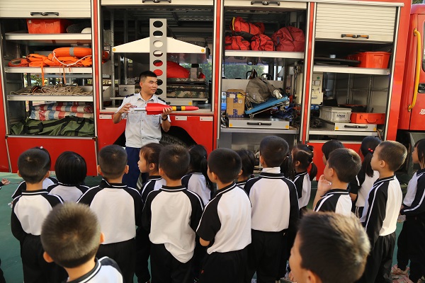 消防安全教育班會(huì)課 潭小師生參加消防逃生演練 潭小學(xué)子一馬當(dāng)先 潭小學(xué)子參觀消防車(chē)并認(rèn)真聆聽(tīng)消防官兵的講解