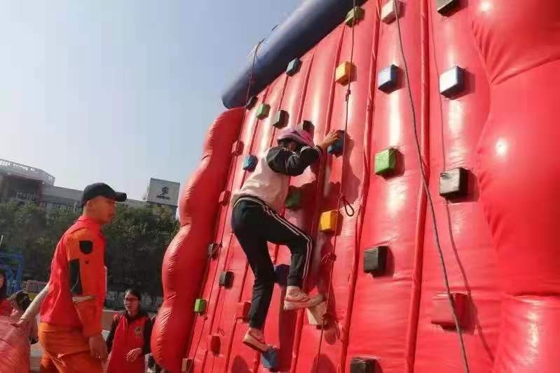 高空逃生技巧是一項非常重要的技巧。同學(xué)們在教練的講解下,紛紛進行高空逃生,同學(xué)們勇敢地爬到了最高點再下來。