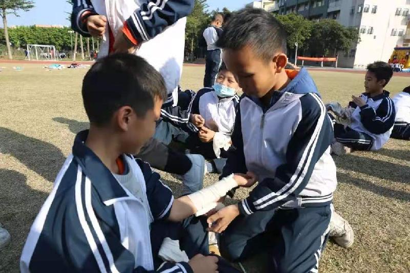 止血包扎是基本的技巧。在教練的指導(dǎo)下,同學(xué)們都學(xué)會了簡單的包扎止血技術(shù)。