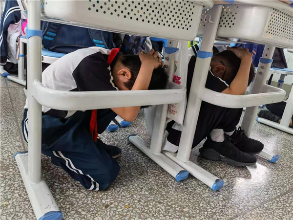主題班會快結(jié)束時,“地震警報”信號響起,原本專心聽講的同學(xué)們,迅速冷靜抱頭下蹲,躲避在桌子底下,高度警惕,等待時機統(tǒng)一撤離。解除“地震警報”信號響起,班主任老師立即指揮、組織學(xué)生,迅速從教室前后門指定疏散路線有序撤離。全體教師分散在各個關(guān)鍵點位,確保學(xué)生撤離途中的安全,堅決不落下任何一個學(xué)生。