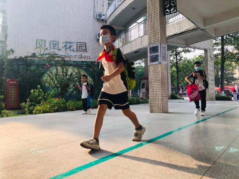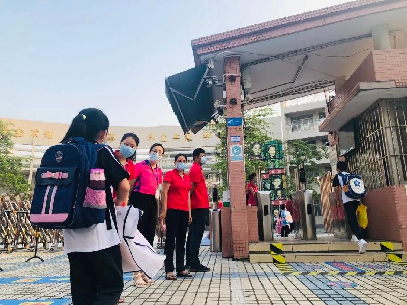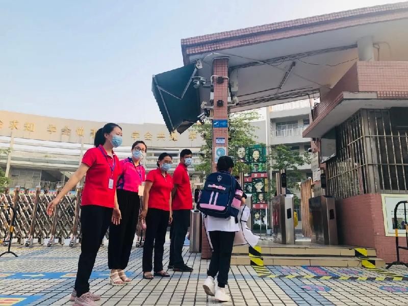 廖校長帶領(lǐng)行政們、值日老師和家長義工在校門口用最美的微笑和親切的問候迎接一張張可愛的笑臉。學(xué)生們興高采烈地、滿懷期待地進(jìn)入校園。瞧,多想快些見到老師和同學(xué)們,簡直是健步如飛呀!