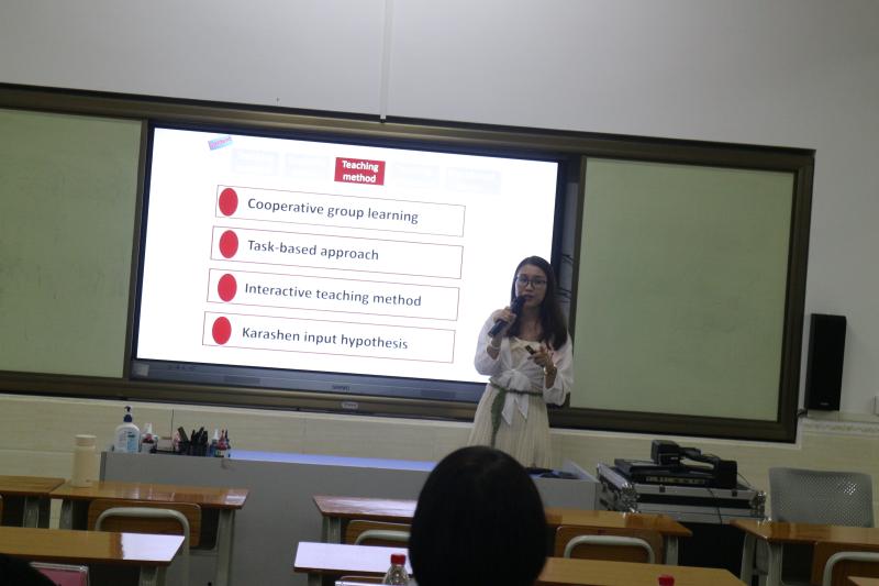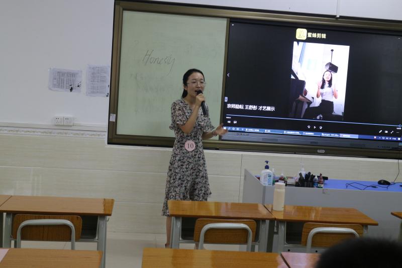 第二環(huán)節(jié)是選手按抽簽順序進(jìn)行才藝展示及演講比賽。每位選手首先播放錄制的才藝視頻或者進(jìn)行現(xiàn)場(chǎng)三分鐘才藝展示,然后按照抽簽的題目進(jìn)行三分鐘英文演講。才藝展示中,選手們“各顯神通”,從唱歌到鋼琴彈唱,從短視頻配音到拍攝趣味教學(xué)視頻,從現(xiàn)場(chǎng)微課再到錄課展示……可謂讓人大開眼界,嘆為觀止。演講環(huán)節(jié)中,各位青年教師結(jié)合自身經(jīng)歷,紛紛闡述個(gè)人觀點(diǎn),讓人印象深刻。
