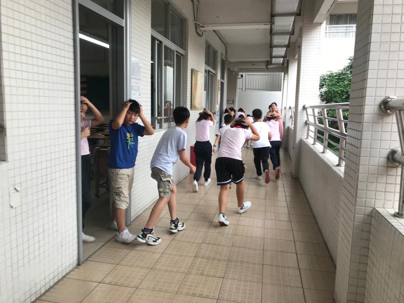 各班主任帶領(lǐng)學(xué)生抱頭沿著指定路線快速疏散