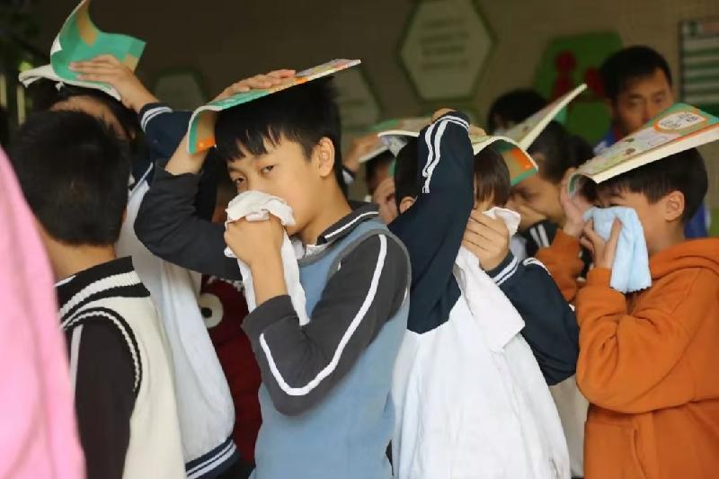 學(xué)生一個(gè)跟著一個(gè),注意安全,一手用書(shū)本保住頭部,另一只手捂住口鼻,安全有序撤離。