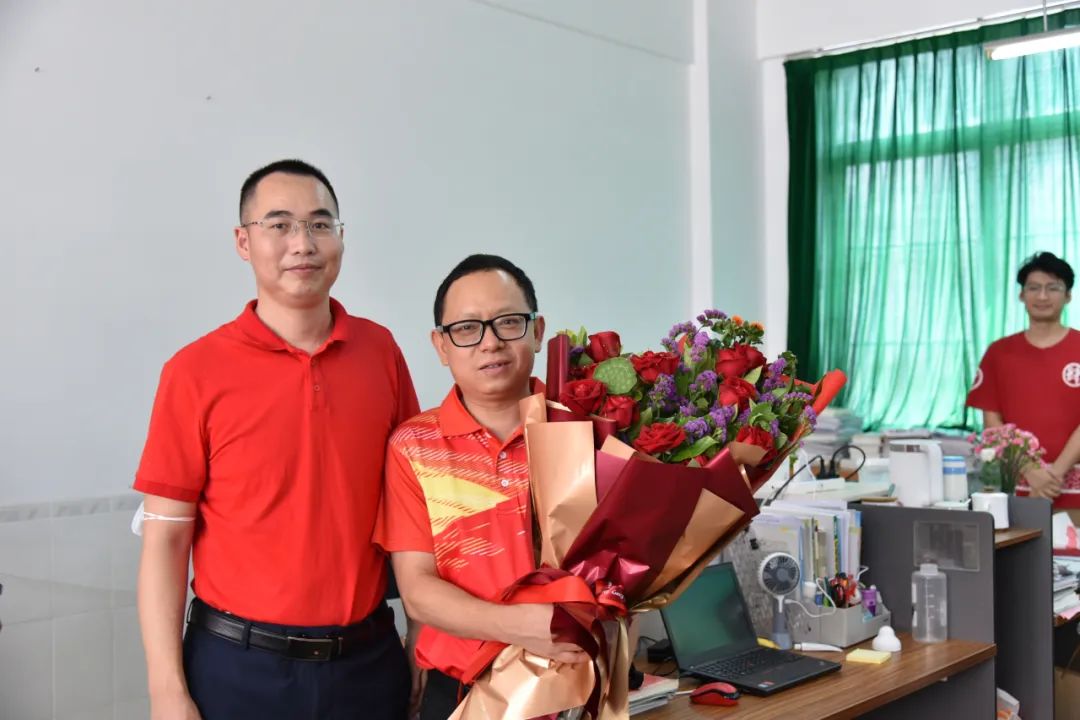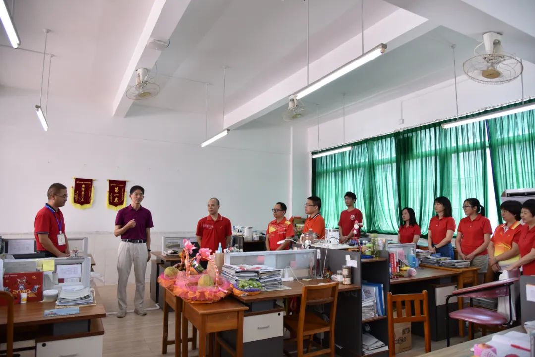 在白建元副校長(zhǎng)及陳水繹副校長(zhǎng)等的陪同下,張毅副局長(zhǎng)一行來(lái)到初三教師辦公室為初三老師送上寓意“碩果累累”的夏日水果及寓意“大紅大紫、好事連連”的鮮花,并與老師們進(jìn)行親切交流。