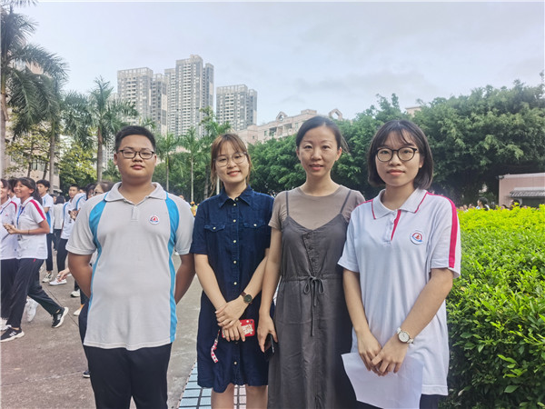兩位同學(xué)與班主任麥靜、曾結(jié)紅老師合影
