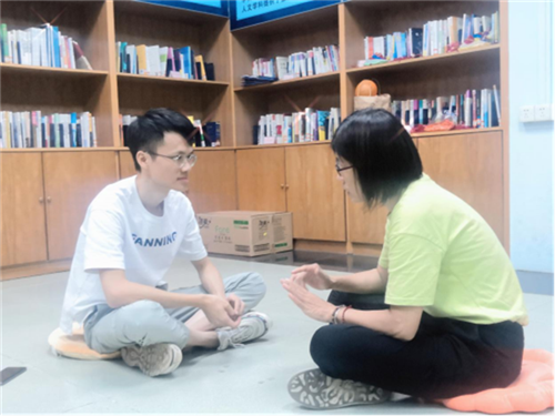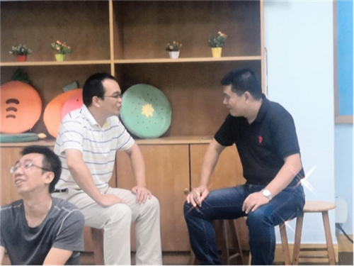 接著進行的是“覺察自我”的小游戲,兩組老師通過內(nèi)外圈的方式進行兩兩配對,共同完成本輪游戲。樂老師希望大家在互相分享的過程中,班主任老師們學(xué)會尋找內(nèi)在力量來應(yīng)對壓力,與壓力共舞。老師們各自配對后,分別向?qū)Ψ椒窒怼爱敯嘀魅巫畛晒Φ囊患隆焙汀白霭嘀魅螇毫ψ畲蟮囊患隆?,其中高?8班班主任魯志明向大家分享了她覺得自己在班主任生涯中最成功的一件事情是在幾年前把一位差點走入歧途的男同學(xué)拉回正道,讓他沒有走入歧途,最后順利考上大學(xué)。那一刻,魯老師說她真的為自己是一名班主任而感到自豪。這一個小故事的分享讓大家都深有體會,并與之產(chǎn)生共情。高三4班班主任莫枝棋老師談到自己二十多年班主任生涯中讓自己頗感壓力的是孩子們現(xiàn)在的心理狀態(tài)受信息化影響變得越來越不穩(wěn)定,學(xué)生心理問題也越來越多,但自己會堅持做好家校的聯(lián)動,關(guān)愛學(xué)生,尤其是心理特殊學(xué)生,一定會努力陪伴他們順利走完高中生涯。