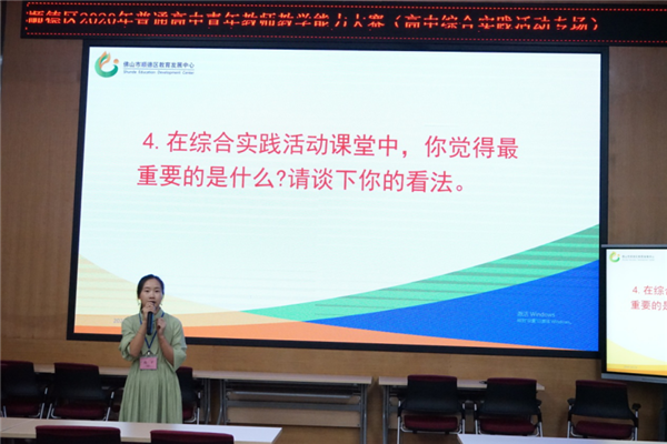 “即興演講”環(huán)節(jié),順德區(qū)給各位選手4分鐘的抽簽準(zhǔn)備, 5分鐘即興演講要求參賽選手現(xiàn)場抽取題目,隨后答辯2-3分鐘。我校胡華杰老師抽到“在綜合實踐活動課堂中,你覺得最要的是什么,請談?wù)勀愕目捶ā钡念}目, 根據(jù)題目,她覺得綜合實踐活動課程的實施,離不開學(xué)生主動用心的實踐和各種實際操作活動,突出學(xué)生主體,意味著把學(xué)生作為課程的主體,一切從學(xué)生的實際出發(fā),激情演講獲得了評委的一致好評。