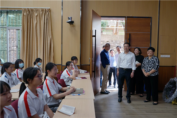 何春云書記初次來到容山中學,便深深感受到容山中學二百多年的深厚文化底蘊。在區(qū)淑玲校長以及校級領(lǐng)導的陪同下,何書記一行深入到校園心理健康教育指導中心、教學區(qū)、運動場以及各功能場室走訪。期間,區(qū)淑玲校長向何書記展示了近年來學校取得的成績以及辦學質(zhì)量提高的成效。區(qū)校長介紹到,容山中學一向貫徹“和而不同,揚長發(fā)展”的辦學理念,通過整合資源、推動課改,充分尊重師生個性化發(fā)展,取得了一系列的優(yōu)異成績。