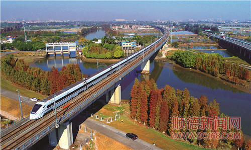 在河涌兩旁金黃色的水杉樹映襯下,一列高鐵恍如進入黃金大道。