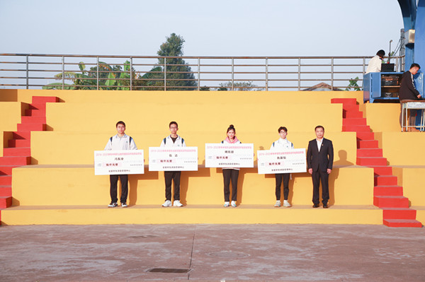 儀式上,黃清海主任介紹了中職國家獎學金的具體情況,宣讀了獲得國家獎學金的4名學生名單以及優(yōu)秀事跡,并對他們表示衷心的祝賀。隨后,梁澤洪校長為獲獎同學進行頒獎。