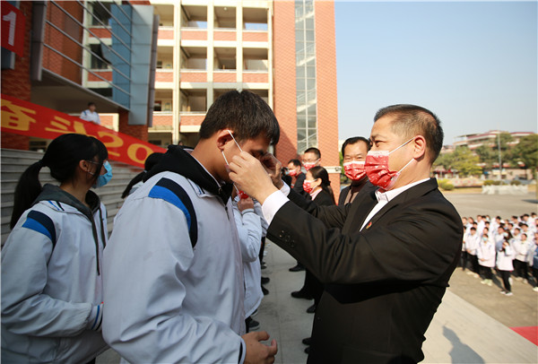 傳遞能量,牛氣沖天。全體學(xué)校行政為各班學(xué)生代表送上“牛氣沖天”的紅口罩,并把巧妙地融合了各班班主任名字的祝福車牌贈(zèng)送給各班的班主任,再次為學(xué)子們送上濃濃的祝福。