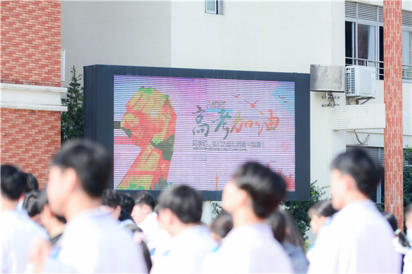 隊(duì)列整齊,旌旗飄揚(yáng),伴隨著歌曲《奔赴考場(chǎng)》,高考?jí)研袃x式拉開了序幕。