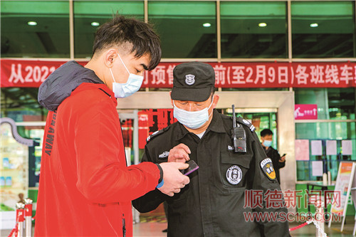 順德客運總站安保人員在售票廳前查看市民的健康碼。/珠江商報記者朱德文攝