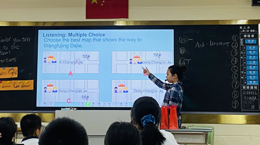 課前,馮老師集思廣益,與備課組老師進行了充分的準備。上課一開始,馮老師就借助希沃白板,利用路線圖游戲活動激發(fā)學生的興趣,寓教于樂,在游戲任務(wù)活動中展開知識點的輸入學習。經(jīng)過一系列的準備和導(dǎo)入活動后,馮老師利用多媒體視頻和希沃平臺的游戲幫助學生減少聽力障礙,讓學生獲取相關(guān)的背景知識。在聽力過程中,馮老師一步一步帶領(lǐng)學生去預(yù)測,去泛聽,去精聽文本內(nèi)容,初步獲取聽力文本信息。學生基本掌握了本課關(guān)于問路和指路的知識點之后,教師讓學生通過現(xiàn)實的模擬互動進一步加強了知識點的鞏固,鼓勵學生開口說英語。