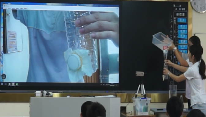 沈老師首先通過高清攝像頭演示水對瓶底和瓶壁的橡皮膜作用情況,引入新課,瞬間激發(fā)了同學們的好奇心,引發(fā)學生思考液壓產(chǎn)生的原因,從而想進一步探究液壓的特點,液壓的計算,為整堂課的順利開展奠定了堅實的基礎(chǔ)。