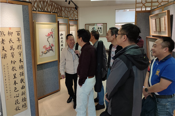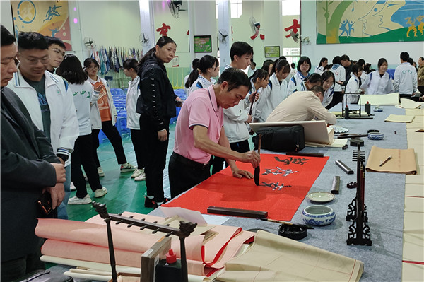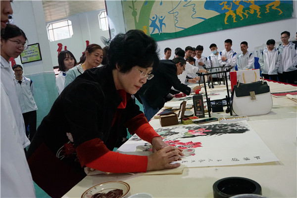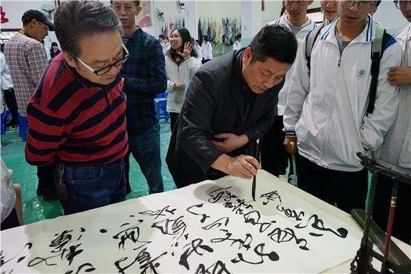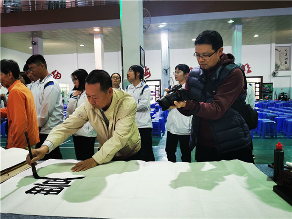 嘉賓們?cè)谖倚C佬g(shù)老師的陪同下,一同參觀了我校歷屆優(yōu)秀名家校友師生書畫攝影作品展,隨后親臨風(fēng)雨室活動(dòng)現(xiàn)場(chǎng),與我校師生一同即席揮毫,翰墨流韻?;顒?dòng)現(xiàn)場(chǎng)熱鬧非凡,我校部分熱愛(ài)書法的教師和書法社的學(xué)生亦積極參與到其中,與書畫名家交流學(xué)習(xí),一同為現(xiàn)場(chǎng)師生帶來(lái)了一場(chǎng)美學(xué)盛宴。