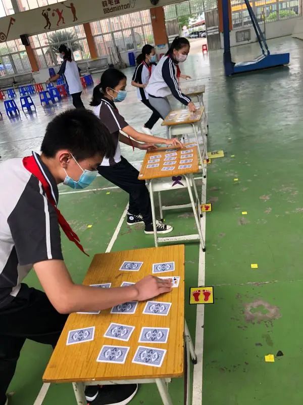 第二個(gè)活動(dòng)是翻牌活動(dòng)。經(jīng)過(guò)分組,全班同學(xué)分成4組,每組同學(xué)排成一隊(duì),逐個(gè)上前翻牌,一次只能翻一張牌,組員們需要將牌面是1-K的撲克牌按順序翻出,率先完成的小組為勝。