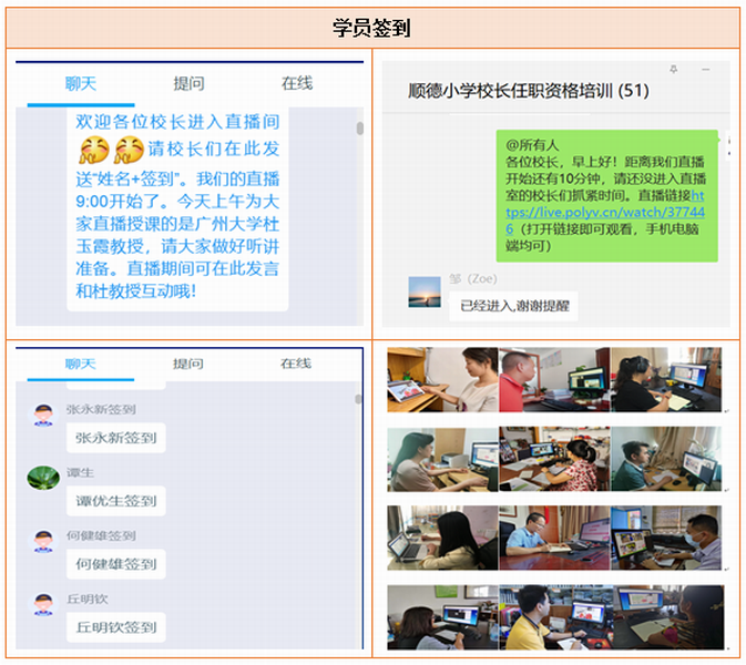 本次直播活動(dòng)采用線上簽到和線下拍照相結(jié)合的簽到方式,并做好開(kāi)播前提醒和直播中監(jiān)控工作,確保全體學(xué)員參與直播活動(dòng)。