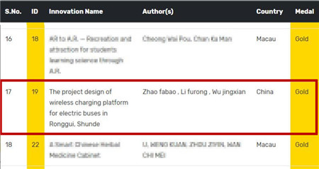 2020年7月6日-8日,受新冠疫情影響,全球首創(chuàng)的虛擬創(chuàng)新博覽會――波蘭“E-NNOVATE”2020在虛擬展臺上盛大開啟,通過在虛擬展臺上展示參加者的創(chuàng)新發(fā)明作品,并進(jìn)行網(wǎng)上評審及給予公眾投票,讓世界各地的發(fā)明界朋友一起分享。 我校趙發(fā)寶、李富榮、吳靖賢等三位同學(xué)的創(chuàng)新參賽作品《順德容桂電動(dòng)公交車無線充電站臺設(shè)計(jì)方案》斬獲“E-NNOVATE”2020國際發(fā)明展金獎(jiǎng)。