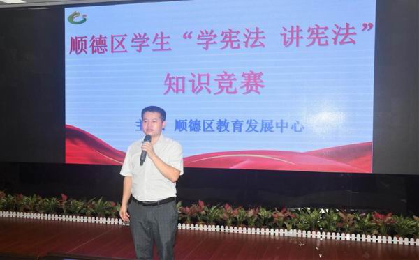 競賽活動上,順德區(qū)教育發(fā)展中心何儀昌副書記做賽前講話,何書記對開展此次競賽活動的背景以及目的、意義進行了解讀,對競賽紀律、規(guī)則提出了具體的要求,同時也寄語參賽選手要學(xué)習(xí)憲法、遵守憲法、維護憲法、運用憲法,爭做憲法小衛(wèi)士。