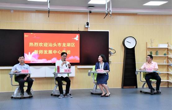 在交流互動(dòng)環(huán)節(jié),汕頭市龍湖區(qū)研訓(xùn)團(tuán)隊(duì)就教研工作的有效開展、質(zhì)量監(jiān)測的系統(tǒng)運(yùn)作、智慧課堂的實(shí)際運(yùn)用等問題進(jìn)行提問,雙方人員積極互動(dòng),交流經(jīng)驗(yàn)。