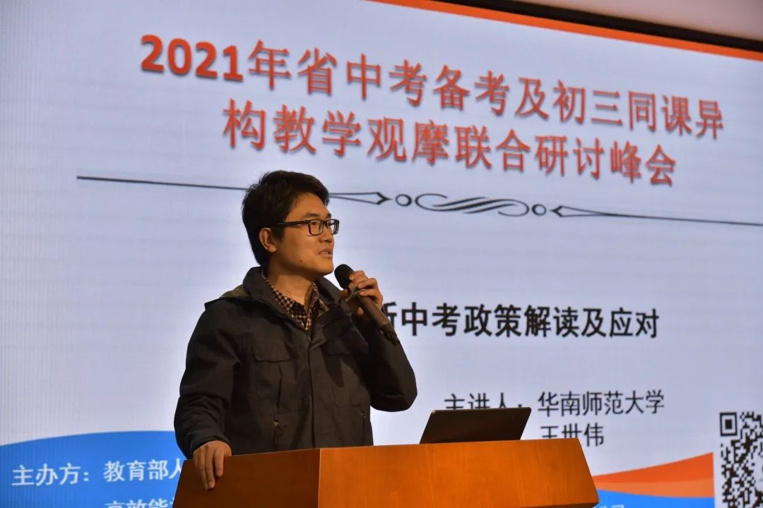 華南師范大學王世偉教授就廣東省新中考政策解讀及應對開展主題講話。王教授表示,中學教育要重視學生的思維能力、整體認知能力培養(yǎng)及考察學生的歸納總結能力,同時,要注重實際應用,關注社會熱點,聯(lián)系實際等,并提出了相關的教學建議。
