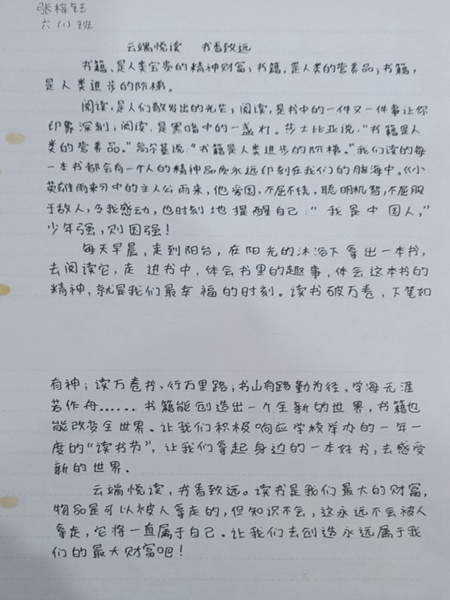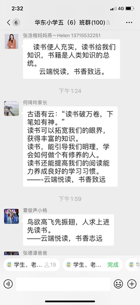 恰逢今天是五、六年級(jí)學(xué)生返校,于是本次活動(dòng)分線下和線上釘釘直播兩部分進(jìn)行。首先,由龍家怡老師向五、六年級(jí)全體師生介紹本次活動(dòng)的意義和介紹讀書(shū)節(jié)啟動(dòng)儀式活動(dòng)流程。其次,由葉麗燕副校長(zhǎng)詳細(xì)解讀本學(xué)期讀書(shū)節(jié)活動(dòng)方案。然后,學(xué)生們觀看讀書(shū)節(jié)啟動(dòng)儀式視頻并撰寫(xiě)觀后感。一到四年級(jí)的讀書(shū)節(jié)啟動(dòng)儀式在釘釘班群上也同時(shí)進(jìn)行。班主任通過(guò)直播向?qū)W生、家長(zhǎng)介紹了本次云端讀書(shū)節(jié)活動(dòng),對(duì)學(xué)生的閱讀方法進(jìn)行指導(dǎo)后,觀看讀書(shū)節(jié)啟動(dòng)儀式視頻。視頻中,龍江鎮(zhèn)教育局教研專(zhuān)干陳金梅、龍江鎮(zhèn)教育局德育專(zhuān)干和專(zhuān)職責(zé)任督學(xué)劉自力、李耀宗校長(zhǎng)、各行政干部、骨干教師代表、家長(zhǎng)和學(xué)生代表通過(guò)引用關(guān)于“讀書(shū)”的名人名言,號(hào)召全體師生多讀書(shū),讀好書(shū),積極參與到讀書(shū)節(jié)的各項(xiàng)活動(dòng)中去。在看完了讀書(shū)節(jié)啟動(dòng)儀式視頻后,同學(xué)和家長(zhǎng)紛紛表示:視頻拍得太好了,讓人深深陶醉在書(shū)香中。六(4)班彭誠(chéng)真同學(xué)在觀后感里面寫(xiě)到:書(shū)籍,可以滋養(yǎng)我們的靈魂。讓我們與書(shū)相伴,幸福成長(zhǎng)。二(6)班劉雅婷家長(zhǎng)說(shuō):為華東小學(xué)的讀書(shū)節(jié)點(diǎn)贊!讓讀書(shū)成為一種時(shí)尚,讓學(xué)習(xí)成為一種習(xí)慣。讀萬(wàn)卷書(shū),行萬(wàn)里路!
