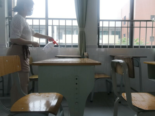 班主任對課室進行清潔消毒