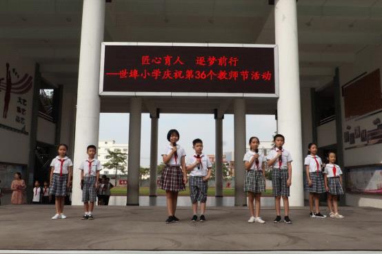 最后,全校教師一起走上階臺,接受少先隊(duì)員代表們的獻(xiàn)花。少先隊(duì)員代表們手捧一支支鮮花走上臺來,恭敬地將手中的花朵送給我們敬愛的老師,借此表達(dá)他們對老師最崇高的敬意??粗瑢W(xué)們送來的一朵朵鮮花,老師們都露出了感動(dòng)的笑容,向同學(xué)們表達(dá)了真誠的謝意以及內(nèi)心的喜悅。
