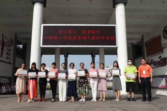 接下來,,世埠小學(xué)八名學(xué)生代表上臺向全體教師獻(xiàn)詞。耕耘密無痕,潤物細(xì)無聲,他們用滿懷感恩的聲音向所有教師獻(xiàn)上節(jié)日的祝福。伴隨著陣陣感動(dòng),羅校長為獲得2019學(xué)年學(xué)校優(yōu)秀班主任、優(yōu)秀副班主任的老師們頒獎(jiǎng),勉勵(lì)獲得表彰的老師充分發(fā)揮示范帶動(dòng)作用,激勵(lì)全體教師奮發(fā)向上,勇當(dāng)先進(jìn)。