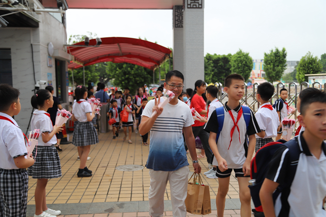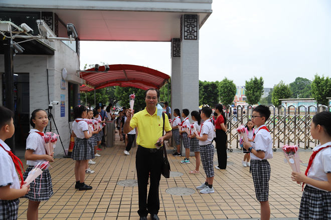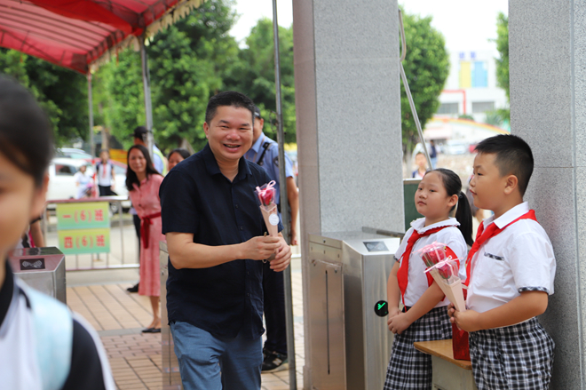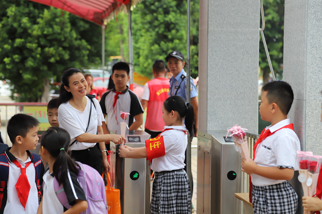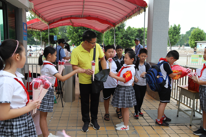 9月10日早上,少先隊(duì)隊(duì)員代表們手捧鮮花列隊(duì)為教師們送花。一朵鮮花,一個(gè)微笑,一份感恩,就這樣在華東小學(xué)校門(mén)口傳遞著。