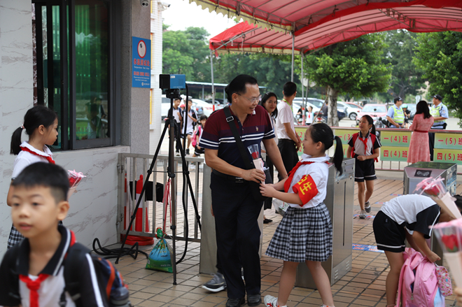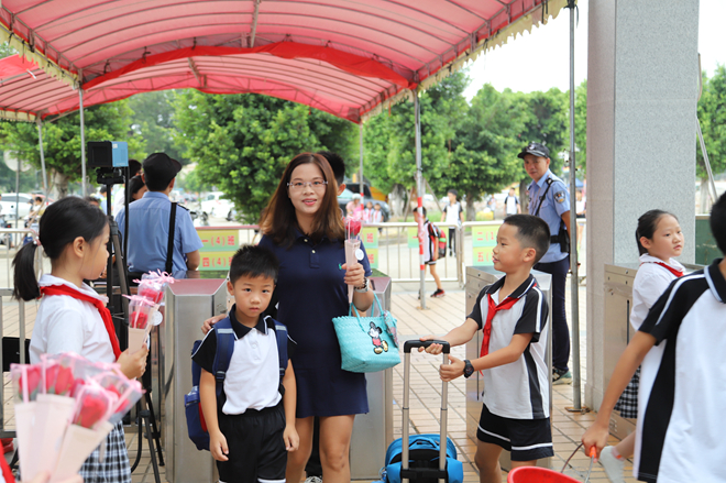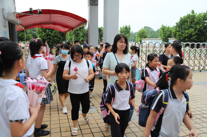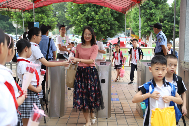 9月10日早上,少先隊(duì)隊(duì)員代表們手捧鮮花列隊(duì)為教師們送花。一朵鮮花,一個(gè)微笑,一份感恩,就這樣在華東小學(xué)校門口傳遞著。