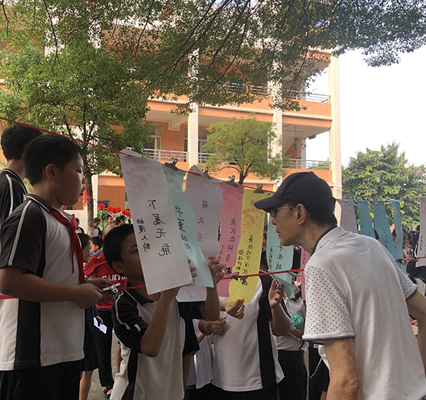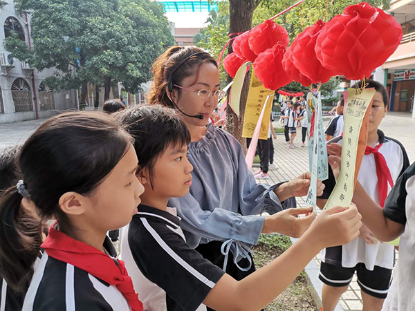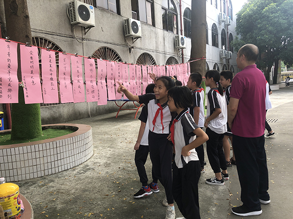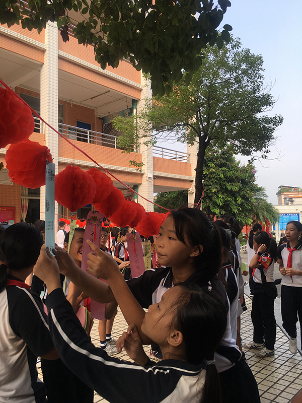 是日,秋高氣爽,紅燈籠系著謎條,在秋風(fēng)中飛舞。孩子們快樂(lè)地穿行在謎條間,或沉思,或討論,或駐足仰望……絡(luò)繹不絕。猜中了,取下謎條,興沖沖地走到兌獎(jiǎng)區(qū),換來(lái)一顆顆甜甜的糖果。猜不中,也不泄氣,繼續(xù)思考……燈謎協(xié)會(huì)到譚沃宏老師和葉汝泉老師也一同前來(lái),跟我們到小謎友互動(dòng),他們上那么耐心地講解,孩子們仰著腦袋,認(rèn)真聆聽(tīng)著……