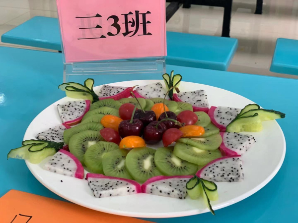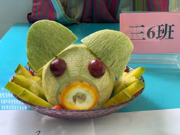 首先進(jìn)行的是“水果拼盤(pán)”比賽。每班組成一個(gè)美食小隊(duì)制作“水果拼盤(pán)”,比賽中,參賽選手們?nèi)褙炞?,互相配合、分工合作,力?zhēng)展示自己的獨(dú)特創(chuàng)意,更增添了此項(xiàng)比賽的藝術(shù)性。一個(gè)個(gè)普通的水果在同學(xué)們的靈心巧手之下變成一個(gè)個(gè)藝術(shù)品,富有詩(shī)意的拼盤(pán)名字更突顯同學(xué)們深厚的文學(xué)水平,對(duì)拼盤(pán)創(chuàng)意的精彩解說(shuō)展現(xiàn)了同學(xué)們明捷的思維和伶俐的口齒。評(píng)委老師對(duì)拼盤(pán)作品嘖嘖稱嘆,對(duì)同學(xué)們的表現(xiàn)贊不絕口,活動(dòng)評(píng)選出“垂涎欲滴獎(jiǎng)”、“創(chuàng)意滿分獎(jiǎng)”、“色香俱全獎(jiǎng)”。