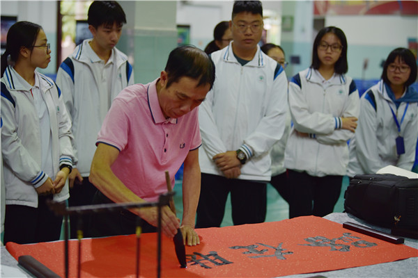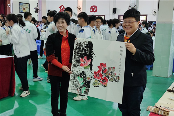 紅棉藝術節(jié)活動的熱潮一浪接一浪,緊接著我校十個班級以大合唱的形式禮贊紅棉,歌詠青春,唱響容山精神。我校為發(fā)揚書院文化與書香文化,與紅棉藝術節(jié)同期舉辦的還有引人矚目的讀寫活動。同時我校特邀來到現場的著名藝術家們也參與到活動中去。