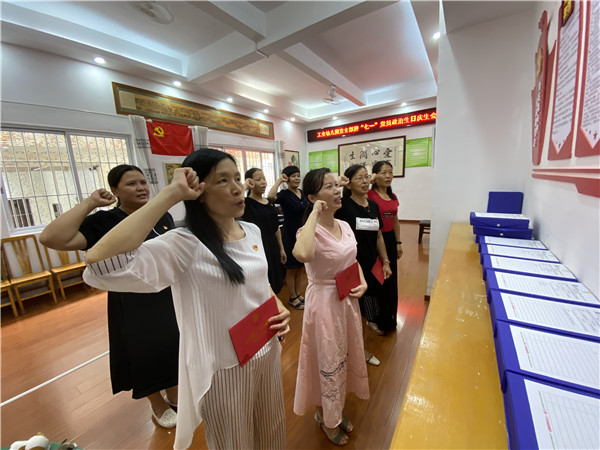 7月1日由黨支部書記柯英麗向在座的黨員們送去節(jié)日的祝福和問候,并介紹了此次活動(dòng)開展的目的和意義。幾位黨員圍繞“如何發(fā)揮先鋒作用”談?wù)勛陨砀形?,找找自身存在的問題和原因,在思想上經(jīng)受一次“洗禮”。隨后,慶祝黨員何秀華、姚麗嫦、吳裕蘭、柯英麗四位同志“政治生日”,在莊嚴(yán)的氣氛中黨支部書記帶領(lǐng)黨員舉起右手,面對(duì)黨旗,重溫入黨誓詞。